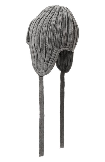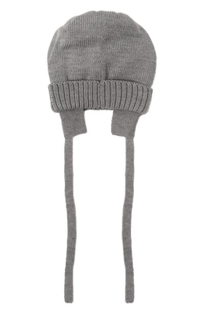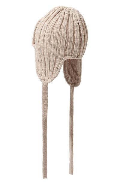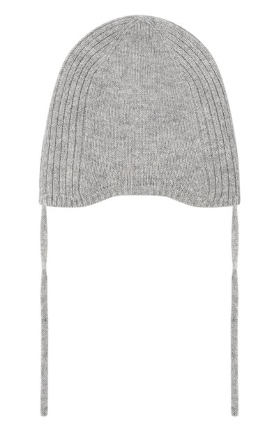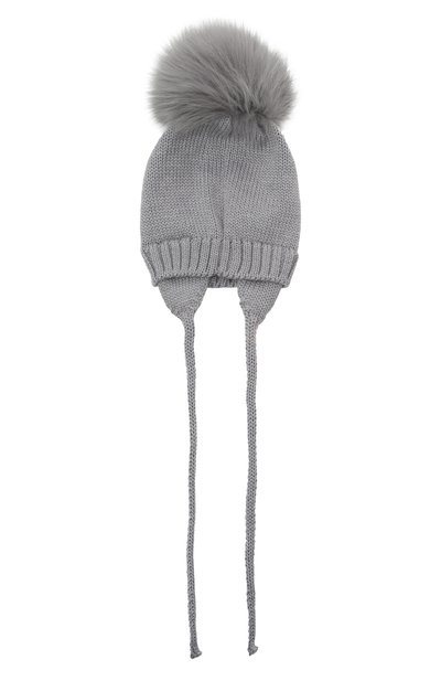 Шапку-чепчик с кантом в рубчик связали из чистого кашемира. Сверху и на длинных завязках аксессуар декорировали помпонами.