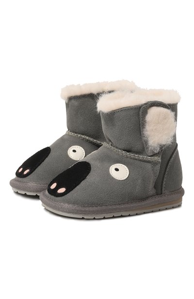 Серые укороченные угги с аппликациями в виде коалы сшиты из фактурной гипоаллергенной овчины с влагоотталкивающей пропиткой. За тепло отвечает мягкий густой ворс, а промежуточная подошва с эффектом памяти и стелька анатомической формы снижают нагрузку на ноги во время ходьбы.
