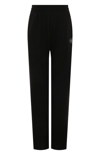Черные брюки с широким поясом и двумя врезными карманами сшиты из гладкого мягкого хлопка. Материал отлично пропускает воздух, а прочные синтетические волокна в его составе не дают одежде растягиваться и пилинговаться. Однотонная модель украшена белым логотипом марки.