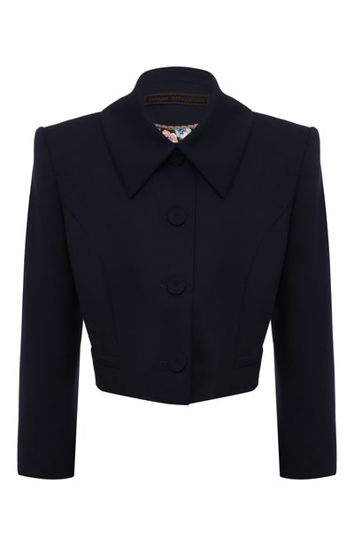 Ульяна Сергеенко экспериментировала с силуэтом жакета из плотной костюмной ткани. Оставив само изделие приталенным, дизайнер сместила смысловой акцент на ярко выраженные плечи и четкие линии отложного воротника, а низ оформила нейтрально: здесь едва заметны планки, имитирующие карманы. Модель с рукавами длиной 3/4 застегивается крупными пуговицами в тон.