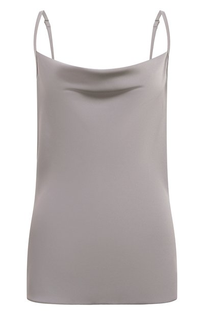 Для пошива топа в бельевом стиле мастера марки использовали мягкий шелковистый полисилк стального оттенка. Спереди модель с глубоко открытой спиной декорировали объемной драпировкой, создав деликатный акцент на декольте. Узкие бретели дополнили слайдерами, регулирующими длину.
