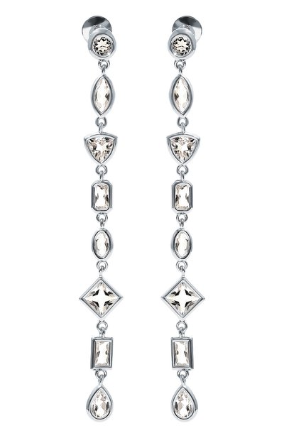Серьги с застежками-пусетами из гипоаллергенного родированного серебра 925 пробы отзываются на малейшее движение, вспыхивая и переливаясь в лучах света. Такой эффект создают длинные подвески, собранные вручную из кристаллов горного хрусталя разной формы огранки.