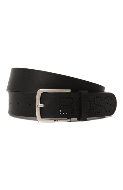 Для изготовления черного ремня использовали прочную фактурную кожу. Аксессуар с серебристой прямоугольной пряжкой декорировали перфорированным мотивом в виде логотипа бренда. Такая модель гармонично завершит повседневный образ.