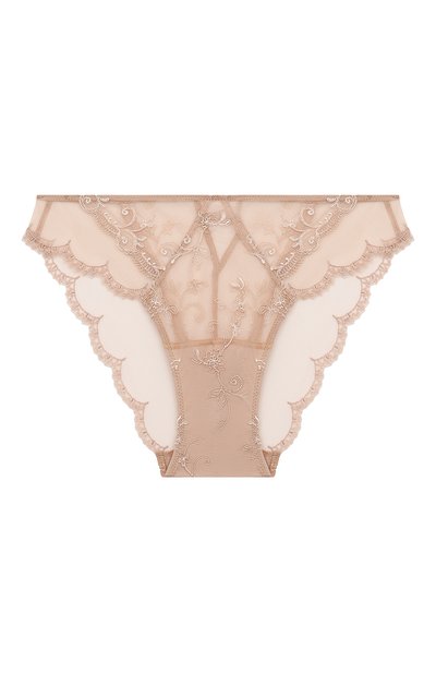 Бежевый оттенок и полупрозрачный тюль делают слипы почти незаметными на теле, а чувственности им добавляет изысканная фактурная вышивка. Ей вторят фестоны, подчеркивающие края. За счет стрейчевых волокон в составе материала и тщательно проработанных швов модель мягко облегает фигуру.