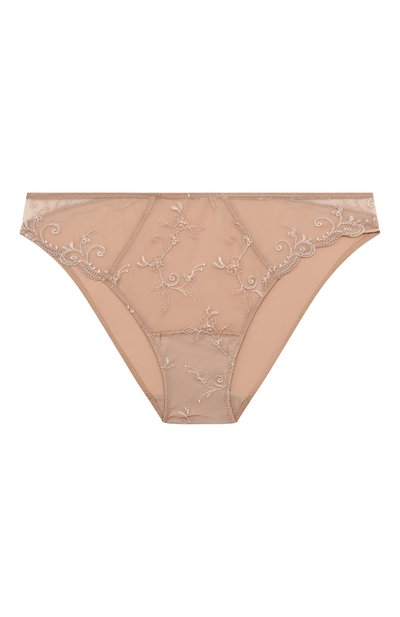 Для изготовления слипов бежевого цвета, почти сливающегося с оттенком кожи, мастера марки использовали полупрозрачный стрейчевый тюль. Материал идеально тянется, поэтому аксессуар с плоскими швами плотно и комфортно садится точно по фигуре. Растительный мотив, выполненный шелковистыми нитями, добавляет модели чувственность.