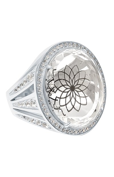 Кольцо из серебра 925 пробы может стать своеобразн ым амулетом, дарующим гармонию и осознание своей жизненной миссии. За это отвечает чакра «Сахасрара», символическим изображением которой украшен центральный элемент из прозрачного горного хрусталя тонкой огранки. В унисон его сверкающему блеску выступает паве из миниатюрных искрящихся топазов.