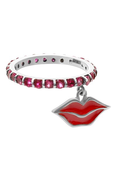 Подвеска в форме губ дала название этому узкому кольцу из серебра 925 пробы. Роль помады играет красная эмаль с глянцевым блеском, а ее цвет повторяет яркое паве. Сверкающие декоративные элементы собраны в тесный ряд, который почти полностью скрывает основу.