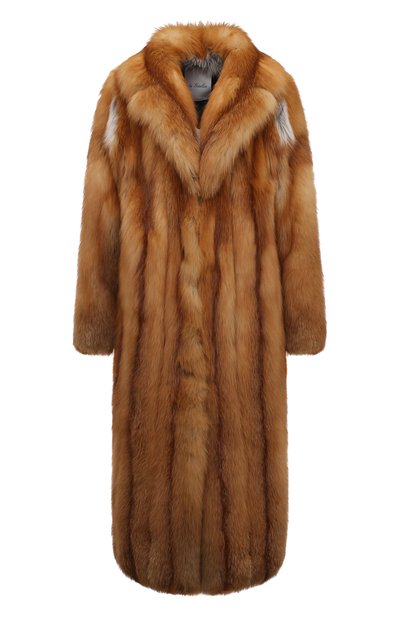 Прямую золотисто-коричневую шубу длиной до середины икры мастера марки сшили из ценного меха канадской лисицы. Тщательно подобранные по цвету и длине ворса шкурки соединили так, чтобы сформировать полосатый мотив с белыми вкраплениями на плечах. Тонкая выделка и особые ручные швы сделали материал легким и пластичным, поэтому модель хорошо драпируется и не утяжеляет силуэт.
