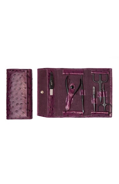 В мягком чехле из фиолетовой кожи с фактурным тиснением под страуса расположили маникюрные инструменты, покрытые тефлоном. Такие изделия не ржавеют и не провоцируют никакие реакции в организме, поэтому безопасны при аллергии на металл. Кроме того, у материала есть «эффект лотоса»: капли влаги и загрязнения не задерживаются на поверхности и не дают распространяться бактериям.