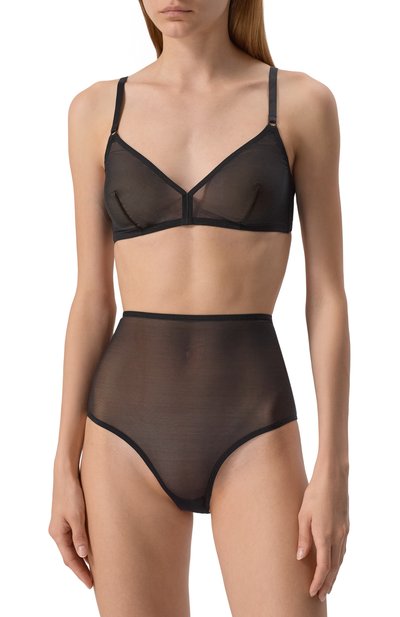 Мастера бренда использовали для пошива черного бюстгальтера с мягкими треугольными чашечками тонкий полупрозрачный текстиль, на котором нитями в тон вышили абстрактный узор. Такой материал практически не ощущается на теле, а узкие регулируемые бретели отвечают за комфортную посадку по фигуре.