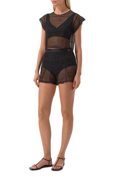 Базовая черная футболка в исполнении команды марки превратилась в топ с провокационно глубоким вырезом, полностью открывающим спину. Его подчеркнули мягкой драпировкой, сформированной с помощью запаха. Для пошива модели с короткими рукавами использовали тонкое ст руящееся джерси из шелковистого модала, свойства которого улучшили нежными волокнами сои.