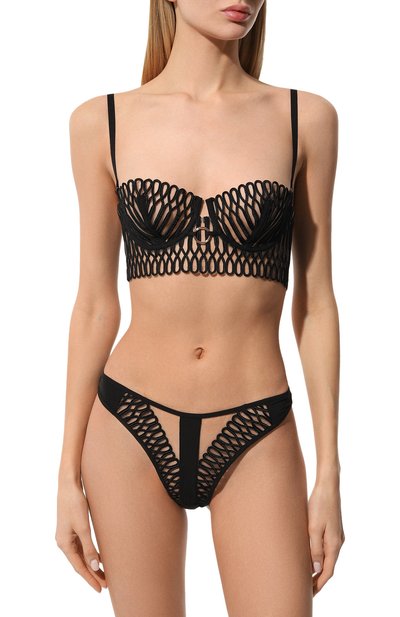 Кажется, что этот черный бюстгальтер собрали из узких шелковистых лент. Иллюзию обнаженной кожи создает основа из полупрозрачного тюля, который почти незаметен на теле. Модель с широкой регулируемой перемычкой сзади застегивается на поясе сбоку короткой молнией. За оптимальную поддержку груди отвечают мягкие чашечки с жесткими вставками снизу.