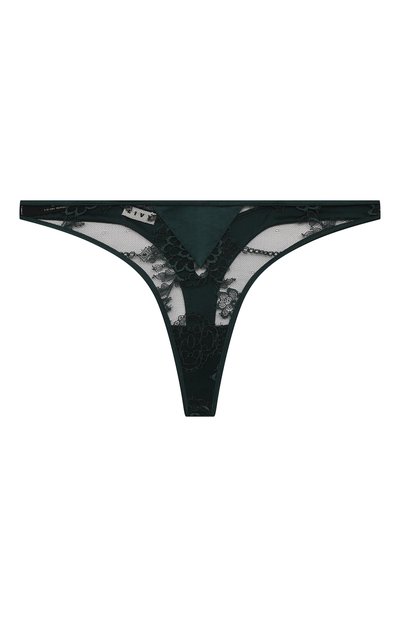 Мастера марки сшили изумрудно-зеленые стринги из гладкого шелкового атласа с характерным блеском и полупрозрачного кружева кале с фактурным цветочным узором. Трусы с узким поясом декорировали сзади овальным вырезом, подчеркнув его золотистой цепочкой.