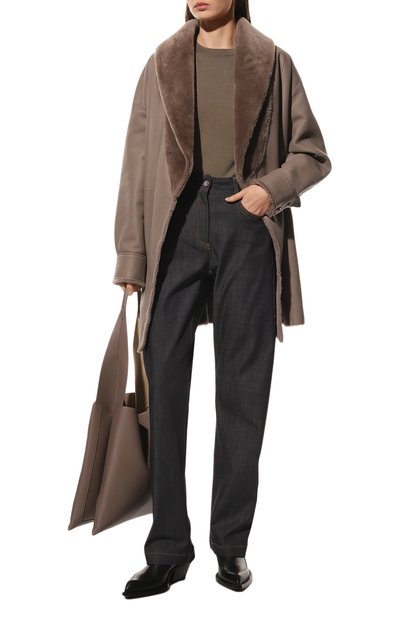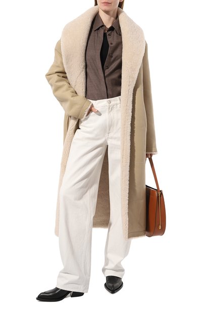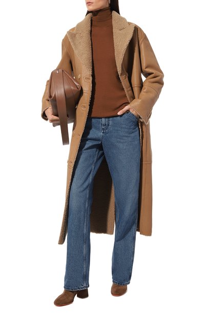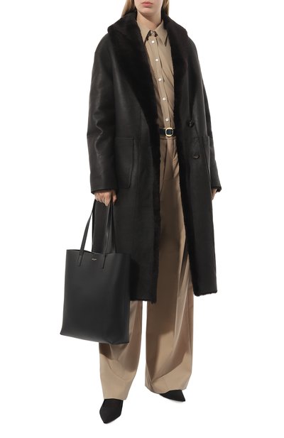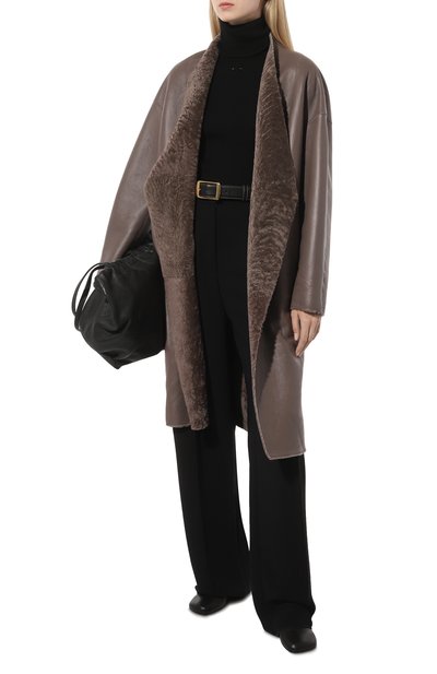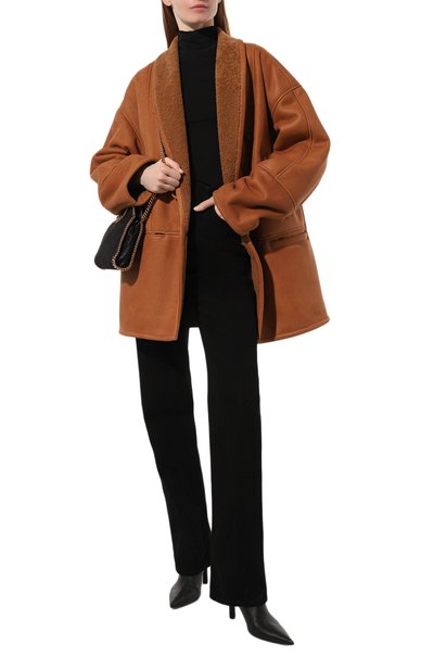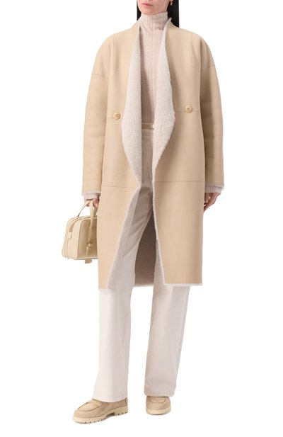 Двустороннюю дубленку с V-образным вырезом дополнили боковыми карманами. Двубортную модель с необработанными краями, сшитую из выделанной вручную овчины, можно носить и кожаной, и меховой стороной наружу.