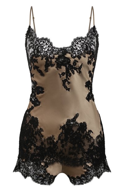 Бежевую пижаму сшили из нежного шелкового атласа. Легкий, приятный на ощупь материал быстро перенимает тепло кожи, делая отдых максимально комфортным. Топ с узкими бретелями и открытой спиной и шорты с эластичным поясом декорировали вставками из черного ажурного кружева с изысканным цветочным мотивом.