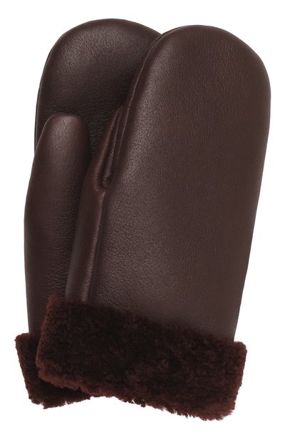 Варежки глубокого винного оттенка надежно защитят от ветра и холода. Для пошива модели дизайнер марки выбрал плотную овчину с зернистой внешней стороной и густым мехом внутри. Пушистый ворс использовали и для отделки снаружи, подчеркнув им манжету.