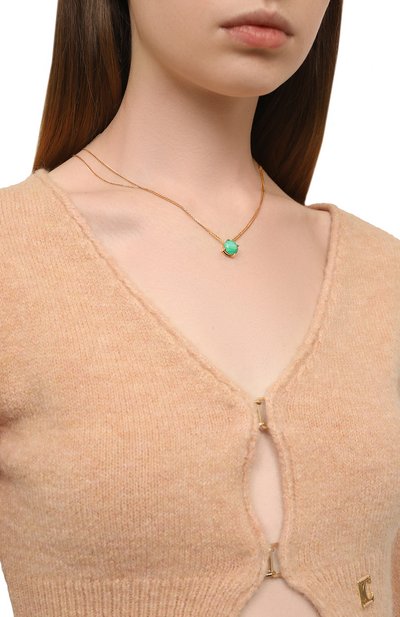 При создании этого кулона дизайнер марки противопоставила его насыщенный зеленый оттенок яркому малиновому цвету текстильного ш нура, регулируемого по длине. Аксессуар неправильной овальной формы выполнили из легкой полимерной глины и покрыли лаком, чтобы придать модели глянцевый блеск.