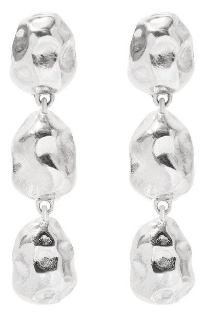 Небольшие серьги дополнят коктейльный наряд и не нарушат лаконичности офисного образа. Аксессуар с овальным скульптурным основанием и двумя такими же подвесками мастера марки изготовили из легкого серебра 925 пробы с текстурированной матовой отделкой.