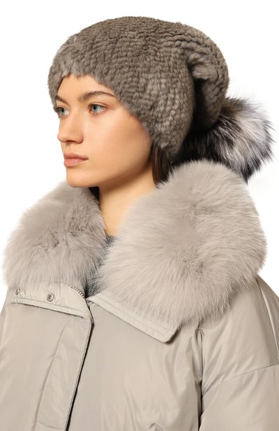 Шапку-пиноккио выполнили из неокрашенного меха норки с коротким шелковистым ворсом. Узкие полосы материала вплели в эластичное трикотажное полотно, поэтому модель плотно облегает.