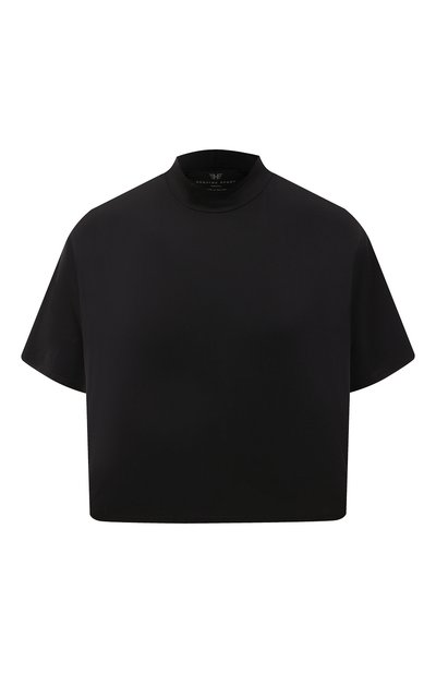 Для пошива укороченной черной футболки с высоким воротом, как у водолазки, использовали гладкий эластичный нейлон, на ощупь напоминающий шелк. Изделие из такого материала не мешает телу дышать и легко тянется, а свободный крой с широкими рукавами не ограничивает движения. Наши стилисты предлагают сделать модель основой непринужденного повседневного образа с брюками и кедами.
