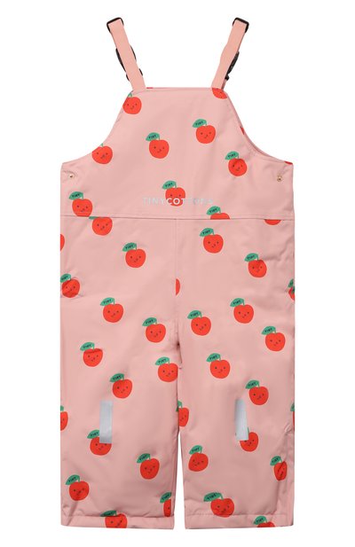 Для создания светло-розового комбинезона с отстегивающимися регулируемыми бретелями использовали прочный текстиль, обработанный водоотталкивающим составом. Этот дышащий материал не промокает и не п родувается ветром, а молнии внизу и эластичные манжеты не допустят попадания снега в обувь. Утепленную модель с принтом в виде яблок дополнили светоотражающими полосками в области колен.