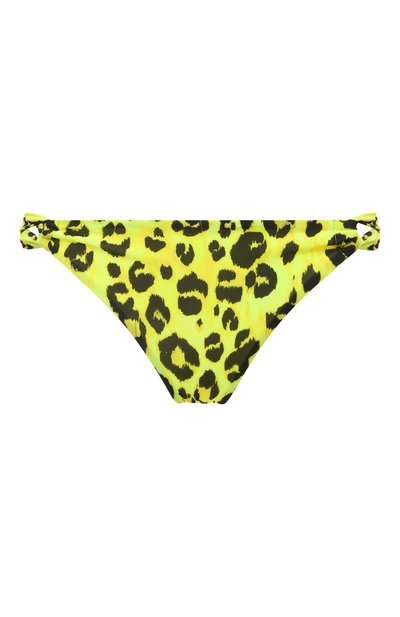 Неоново-желтым плавкам добавили яркости черным контрастным принтом в виде леопардового узора. Для пошива модели, дополненной широкими лентами по бокам, использовали тонкий гладкий нейлон. Чтобы изделие комфортно облегало фигуру, в состав включили эластан.