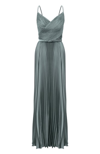 Платье приглушенного мятного оттенка преображается в лучах света. Деликатным блеском отвечает плиссированная тонкая ткань, из которой сшили модель с V-образным декольте. Изделие с узкими бретелями дополнили однотонным регулируемым поясом, акцентирующим внимание на талии.