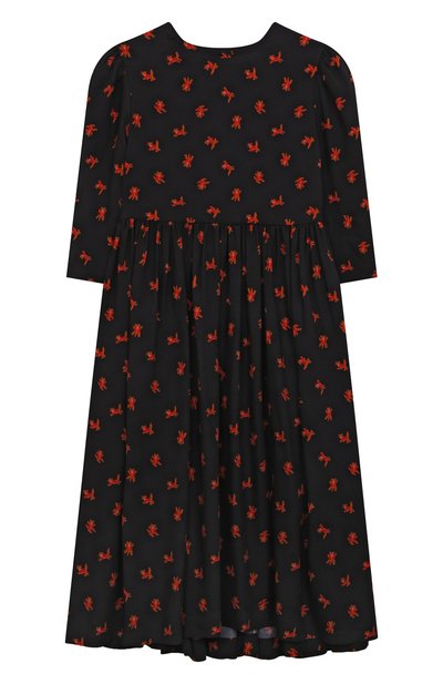 Мастера марки сшили черное платье из тонкой легкой вискозы с ярким принтом в виде кошек. Модель из такого шелковистого на ощупь материала не раздражает кожу и мало мнется. Изделие, застегивающееся на пуговицы сзади, дополнили эластичной вставкой на поясе.