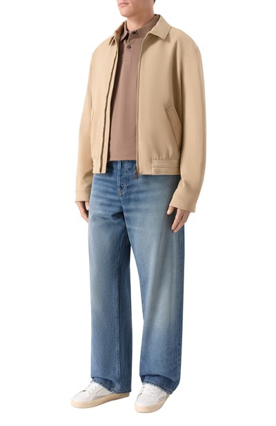Зеленое поло в белую горизонтальную полоску выполнили из мягкого хлопкового пике. Для изготовления материала использовали переработанные волокна, чтобы сэкономить ресурсы и снизить негативное влияние на природу. Модель украсили спереди вышивкой, в которой соединили эмблему марки Ami и узнаваемое изображение пумы.