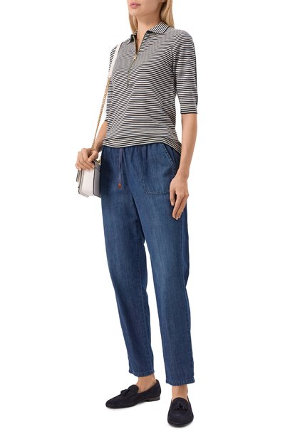 Стилизованный под свободную футболку пуловер со спущенной линией плеч и короткими рукавами делает женственнее деликатное мерцание нитей метанита, подчеркнувших черный полосатый узор. Максимум комфорта в течение дня обеспечат крой, не мешающий движениям, и тонкий трикотаж, в котором переплели схожие по структуре нежный шелк и мягкую вискозу.