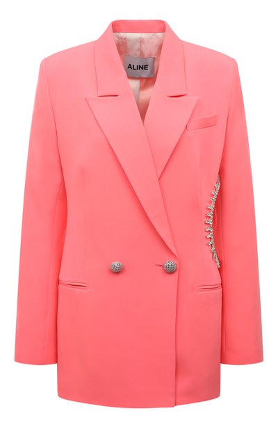 Для создания пиджака с остроконечными лацканами и подчеркнутой линией плеч Алина Нехай выбрала мягкую вискозную ткань, которую сделали прочнее тонкие нити полиэстера. На выразительном коралловом фоне почти немнущегося материала ярко сверкают прозрачные кристаллы, обрамляющие асимметричный разрез сбоку. Такими же блестящими элементами инкрустировали пуговицы спереди и на манжетах.