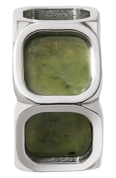 Кафф из серебра 925 пробы вдохновлен архитектурой: изделие напоминает план помещения из трех комнат. Поверхность украшения с родиевым покрытием отполировали до зеркального блеска, контрастирующего с сатинированными квадратными углублениями. В них поместили зеленые нефриты с неповторимым естественным узором, делающим каждый такой аксессуар уникальным.