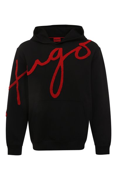Для изготовления черного худи мастера марки использовали мягкий плотный футер с характерной фактурной изнанкой, хорошо сохраняющей тепло. Материал выполнили из отборных волокон органического хлопка, выращенного без применения химических удобрений, загрязняющих грунтовые воды. Дизайнеры бренда, основанного Хуго Фердинандом Боссом, украсили изделие спереди крупным красным логотипом.