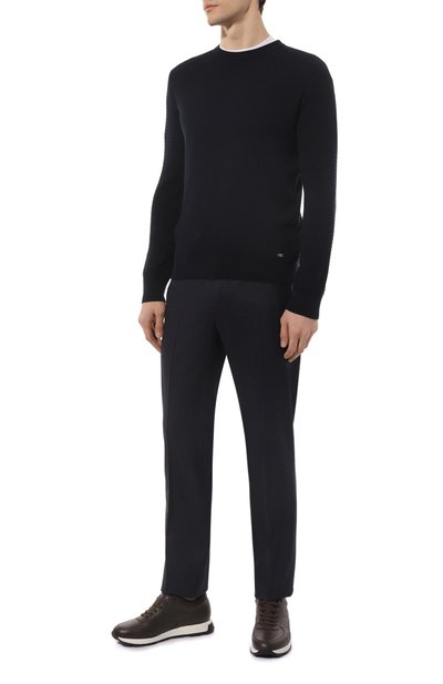 Темно-синий однотонный джемпер с круглой горловиной выполнен из тонкой кашемировой пряжи. Ее мягкие шелковистые волокна настолько легкие, что изделия из такого материала почти не ощущаются на теле, но при этом отлично держат тепло. Нам нравится сочетать эту модель с серыми брюками, и черными курткой и кроссовками.
