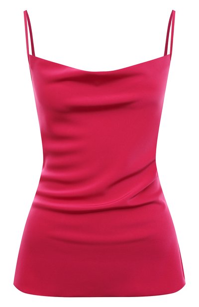 Создавая топ с узкими бретелями, дизайнеры марки особое внимание уделили материалу. Модель с небольшой драпировкой на груди сшили из тонкого струящегося полисилка насыщенного оттенка фуксии. Легкая ткань обладает всеми качествами шелка, поэтому изделие почти не мнется и не теряет форму даже после множества стирок.