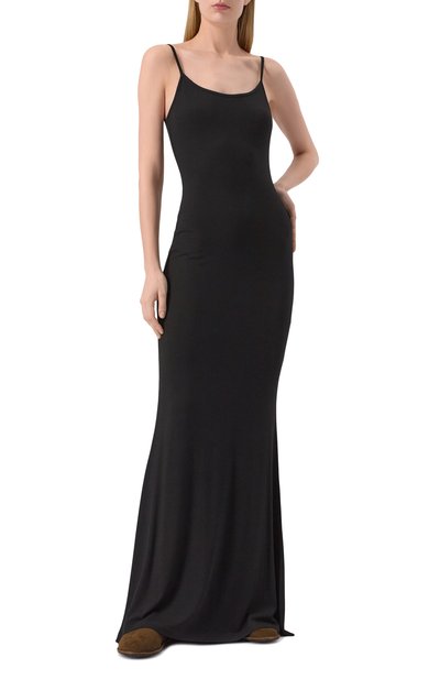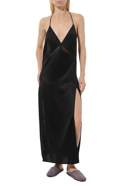 Легкая черная сорочка с регулируемыми перекрещивающимися бретелями и высокими разрезами по бокам сшита из тонкого гладкого модала с шелковистой текстурой. Однотонная модель с кружевной вставкой на груди почти не ощущается на теле, отлично пропускает воздух и не сковывает движения.