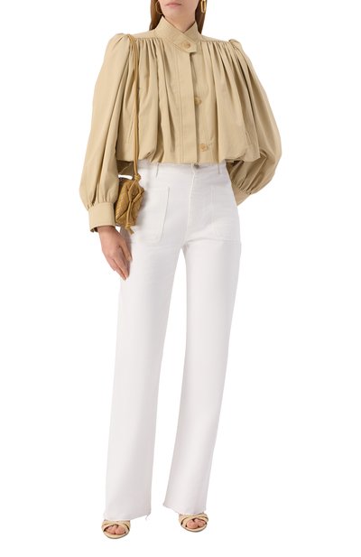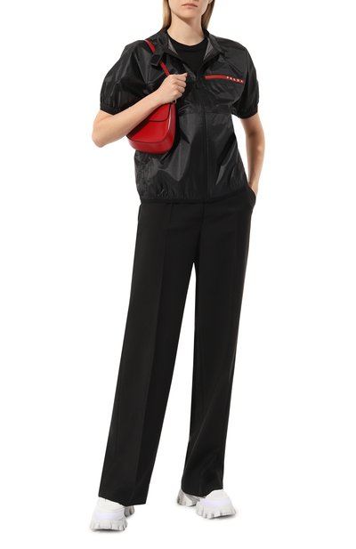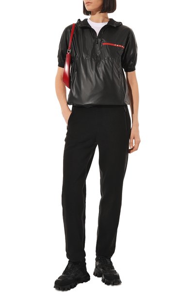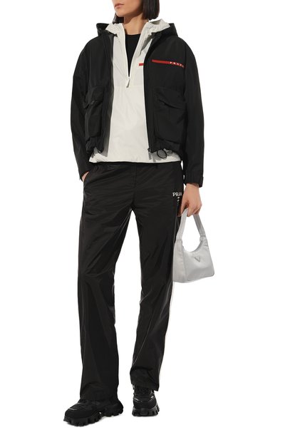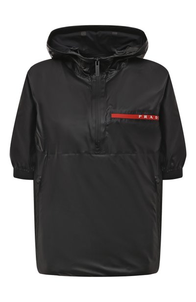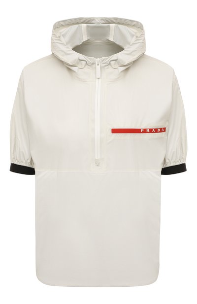 Для пошива куртки с воротником-стойкой и объемным капюшоном Миучча Прада и Раф Симонс выбрали прочный текстиль Gore-Tex Pro. Между двумя слоями ткани расположили мембрану, защищающую от ветра и дождя. Длинные рукава дополнили молниями, которые можно расстегнуть, превратив модель цвета хаки в кейп.