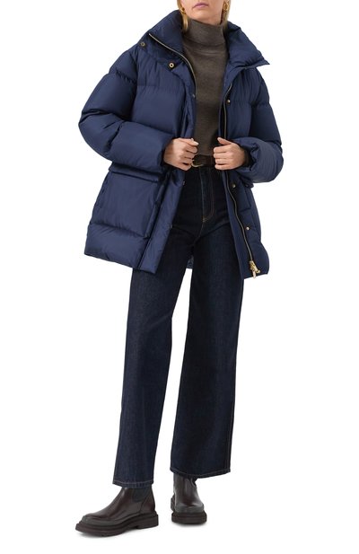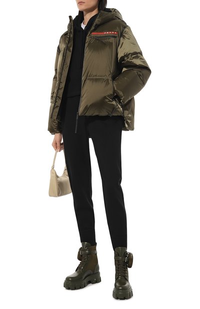 Миучча Прада и Раф Симонс обозначили принадлежность синего укороченного пуховика марке небольшой красной накладкой с логотипом, которую разместили спереди. Модель выполнили из прочного шелковистого нейлона, который отталкивает капли влаги и не продувается ветром. Комфортную температуру обеспечивает утеплитель из отборного гусиного пуха, не утяжеляющего куртку.
