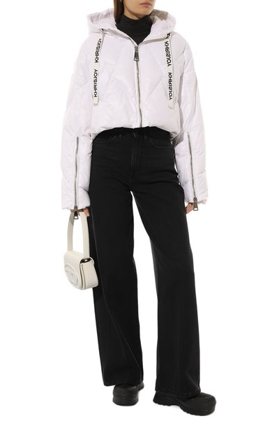 Для изготовления белого укороченного пуховика Миучча Прада и Раф Симонс выбрали легкий шелковистый нейлон, который надежно защищает от дождя и ветра. Стеганую куртку с объемным капюшоном утеплили отборным гусиным пухом. Роль цветовых акцентов отдали черным эластичным манжетам и красной брендированной накладке, знаковой для линии Linea Rossa.