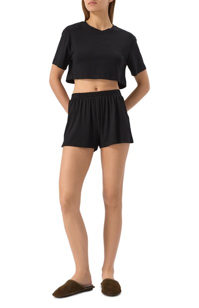 Шорты с эластичным поясом и разрезами по бокам выполнили из шелкового атласа. Короткая модель свободного кроя станет основой комфортного образа для домашнего отдыха.