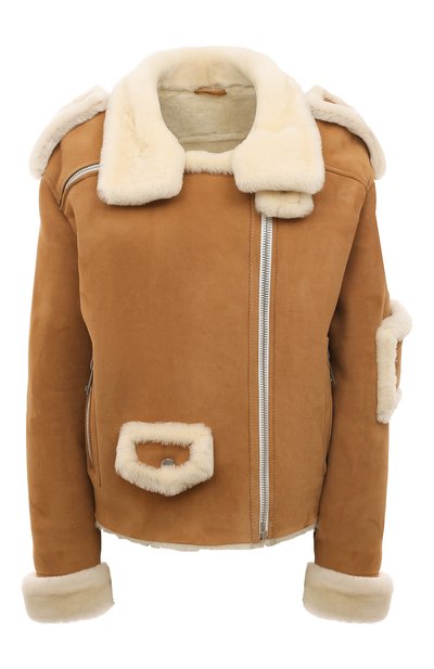 Бежевая дубленка из пластичной овчины тонкой выделки кроем напоминает косуху. Об этом говорят асимметричная молния, погоны и накладные карманы спереди и на рукаве, подчеркнутые кремовой меховой отделкой. Широкий воротник можно поднять и превратить в высокую стойку, защищающую шею от холодного ветра.
