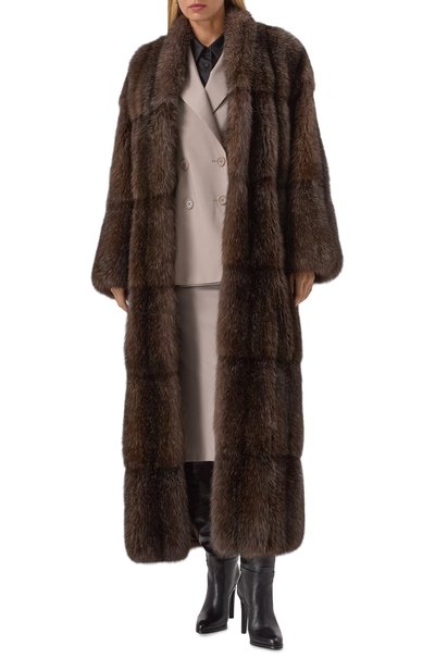 Темно-коричневую шубу с широкими лацканами мастера бренда сшили из драгоценного меха соболя с благородной сединой. Материал с густой подпушью и длинным ворсом согревает даже в суровые морозы, а одежда из него не утяжеляет силуэт. Отделка карманов, погоны, паты на рукавах и пояс, как у тренча, выполнены из фактурной крокодиловой кожи в тон.