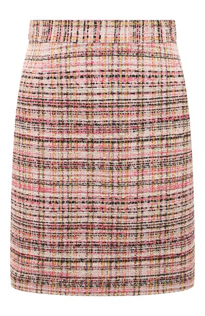Мастера марки, основанной Хуго Фердинандом Боссом, сшили короткую юбку из мягкого фактурного твида на базе нежных волокон хлопка. Черные, розовые, желтые и белые нити плотно переплели, чтобы получился характерный клетчатый рисунок. Прямая модель с завышенной посадкой на талии застегивается молнией сбоку.