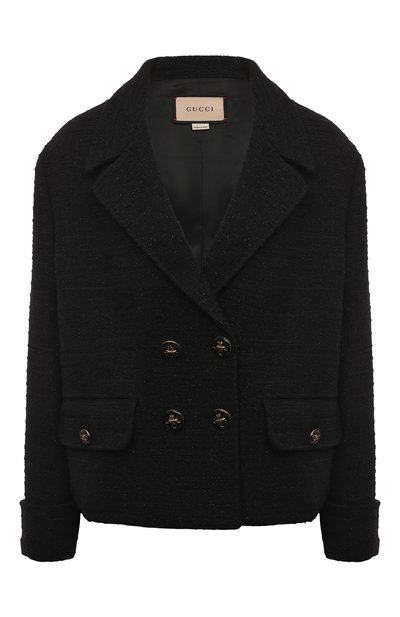 Лаконичному крою черного двубортного жакета с широкими лацканами Алессандро Микеле противопоставил материал. Для пошива модели мастера марки, основанной Гуччио Гуччи, использовали фактурную полушерстяную ткань с добавлением золотистого люрекса. С его блеском рифмуется сияние крупных пуговиц, которыми застегивается изделие.