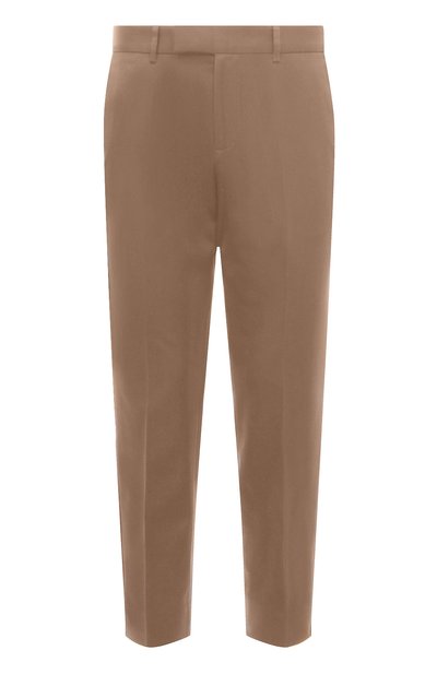 Для пошива прямых бежевых брюк со стрелками мастера марки, основанной Гуччио Гуччи, использовали прочный хлопковый тик. Ткань с плотным переплетением нитей почти не мнется и не вытягивается, поэтому изделие будет долго выглядеть безупречно. Градус формальности модели Алессандро Микеле снизил узкими фактурными лампасами и вставками из знаковой ленты Web над боковыми карманами.