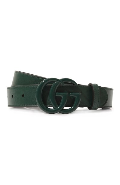 Роль декора у темно-зеленого ремня отдали крупной пряжке в виде монограммы GG. Ее выполнили из прочного сплава, покрытого глянцевой эмалью в тон. Для изготовления аксессуара использовали плотную матовую кожу с фактурным тиснением.