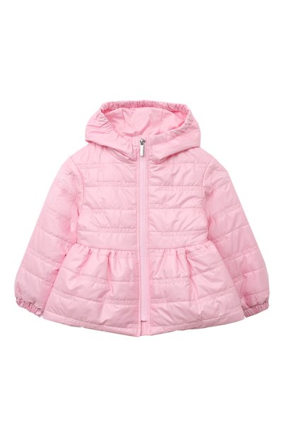 Дизайнеры бренда стилизовали розовую ветровку под мини-платье. Модель с объемным капюшоном дополнили широкой баской, напоминающей расклешенный подол. Для пошива изделия использовали плотный непродуваемый материал. Комфортную температуру поддерживает тонкий слой утеплителя. В стеганом мотиве читается логотип марки.