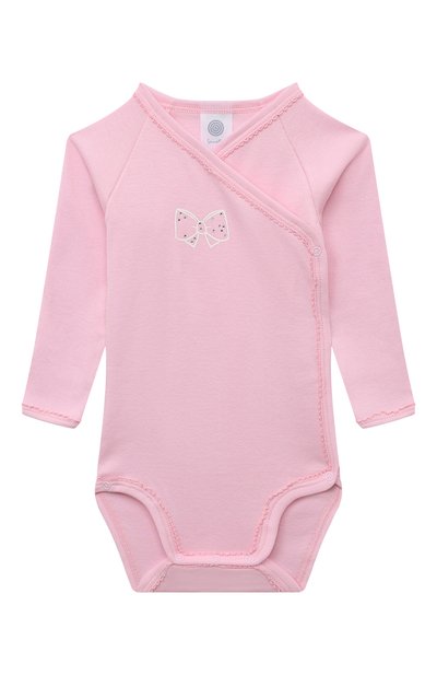Розовое боди дополнили плоскими кнопками по всей длине и вдоль шагового шва, поэтому изделие удобно надевать и снимать. Комфорт обеспечивает и мягкий органический хлопок, который быстро впитывает и отводит влагу от тела, а также немного тянется, не сковывая движения. Спереди модель украсили принтом в виде банта, подчеркнув узор стразами.