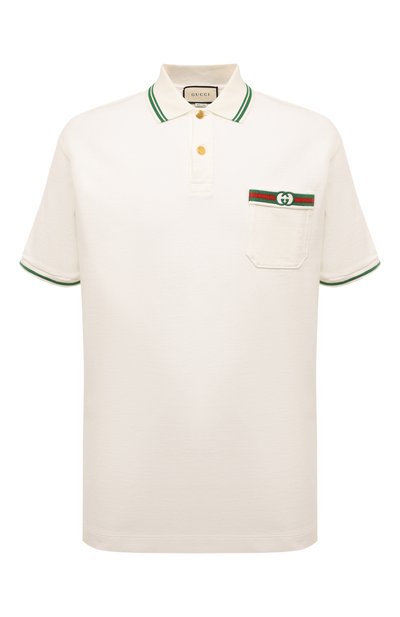 Лента Web и монограмма GG на нагрудном кармане деликатно напоминают о принадлежности свободного поло бренду. Зеленый цвет фирменной вышивки повторяют узкие полоски на воротнике и манжетах, а кремовое джерси подчеркивает яркость деталей. Гладкий трикотаж выполнен из отборного хлопка, поэтому очень приятно ощущается на теле.