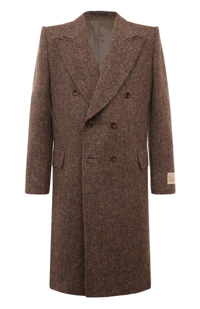 Двубортное коричневое пальто с широкими заостренными лацканами, акцентированными плечами и тремя карманами выполнено из фактурной мягкой шерсти с шевронным узором. Модель с высокой шлицей не мнется, садится точно по фигуре, не утяжеляя силуэт, и хорошо сохраняет тепло.